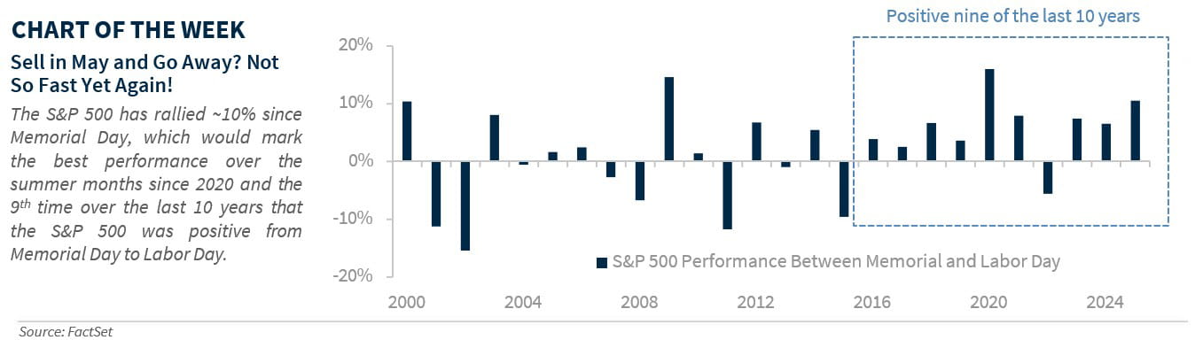Don’t Worry, Be Happy! Heading into summer, markets faced a wave of uncertainty—from shifting tariffs and debt ceiling debates to questions around the fate of the ‘Big, Beautiful Bill.’ The challenges were hard to miss as the ‘wall of worry’ intensified. Yet, despite these headwinds, financial markets pushed through and even outperformed our expectations: the S&P 500 climbed 10.1%, while the Bloomberg Aggregate US Bond Index has added 2.7% since Memorial Day. Once again, this shows that the old adage, “Sell in May and go away,” hasn’t proven to be very accurate. But as we have noted in the past, staying invested—rather than timing the market based on seasonal trends—has historically led to stronger long-term results. Below, we break down this summer’s impressive gains and share our perspective on what we believe lies ahead for the broader equity market, sectors, and bonds.